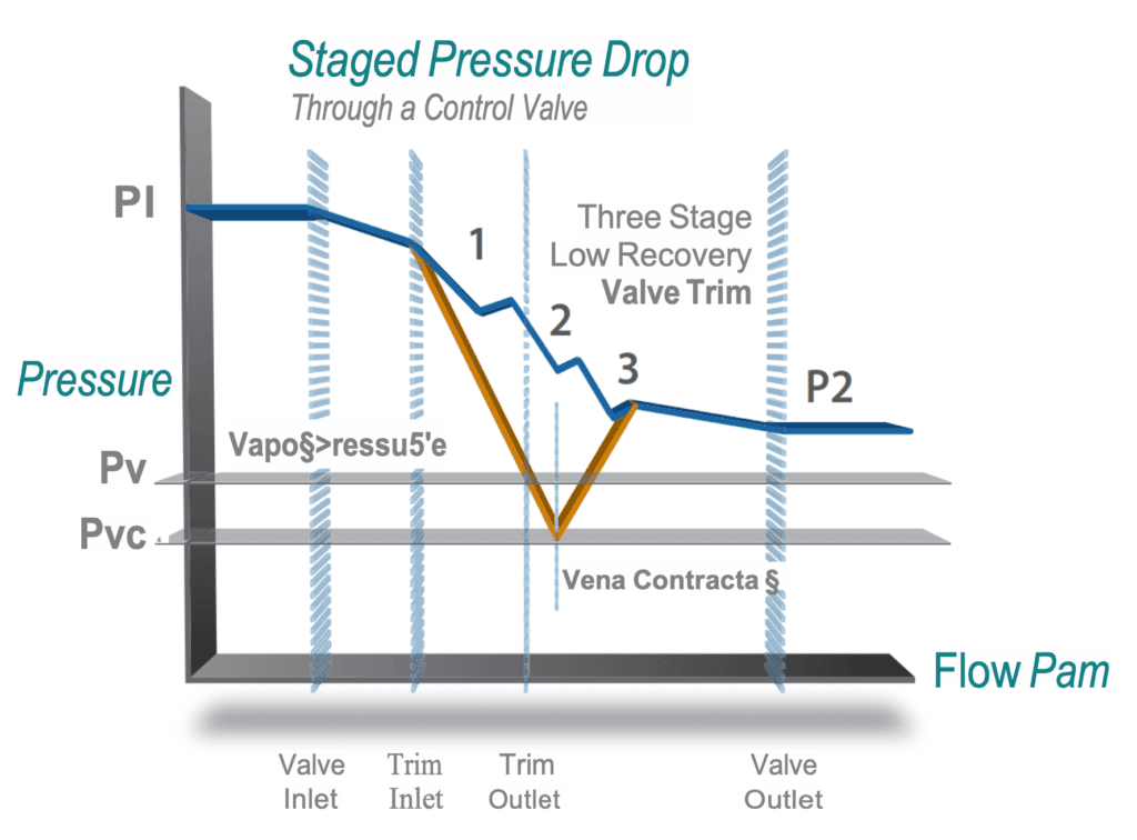 ⦿  Similarly, for noisy applications, the focus of the solution to the unwanted noise originating in the valve is through use low-recovery trim packages that break up the flow into smaller flows, as well as multi-stage pressure reducing cylinders.